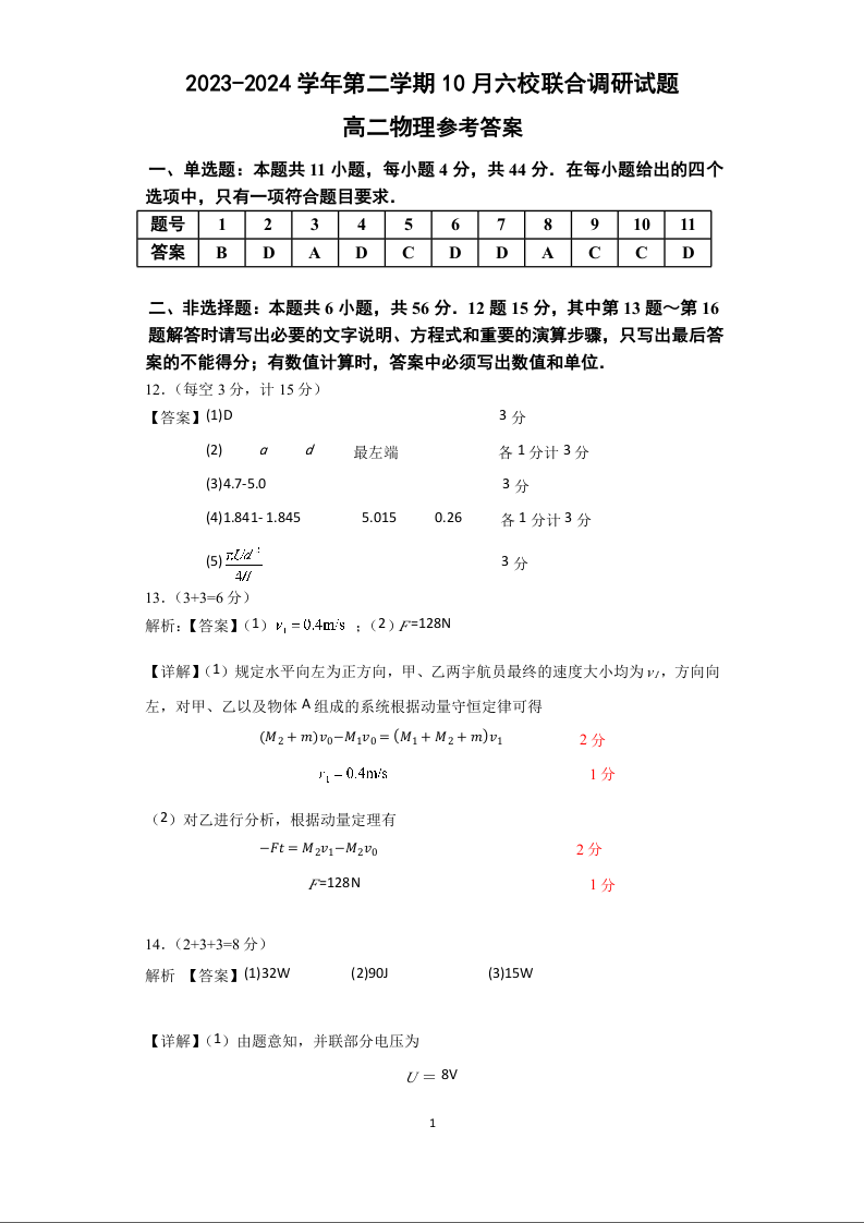 江苏省南京市2024-2025学年第一学期六校联合体10月学情调研测试物理答案