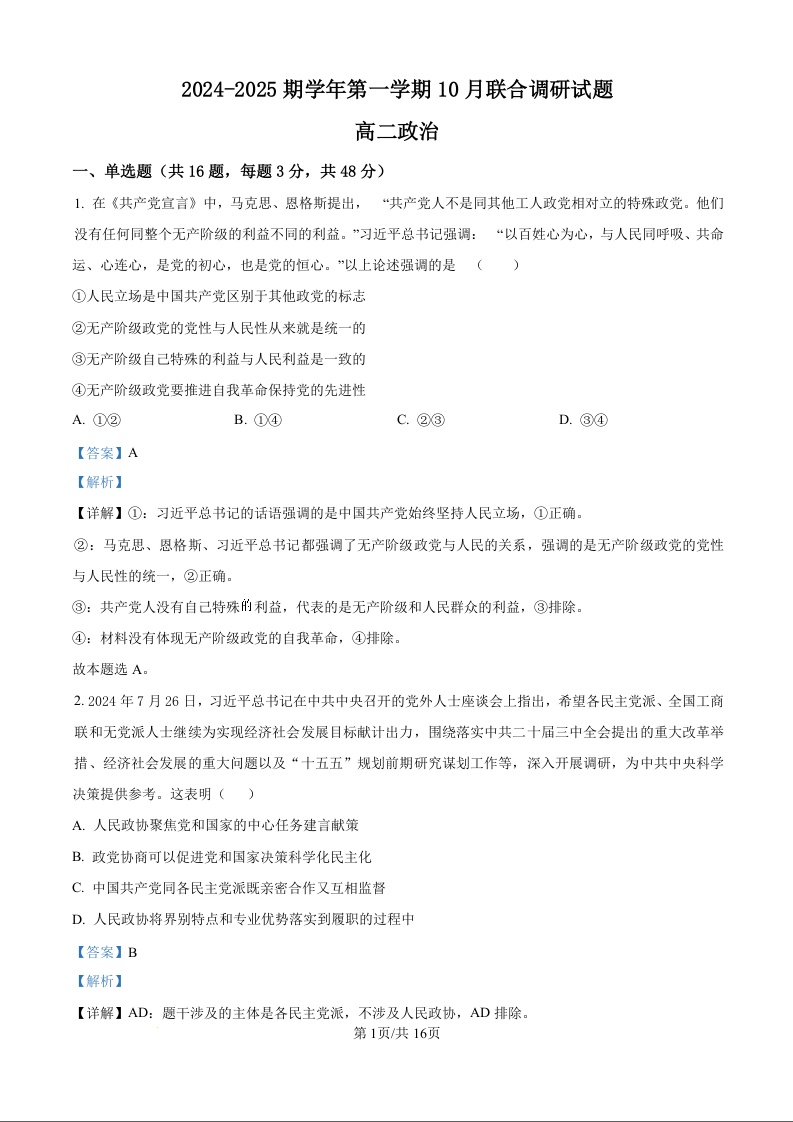 江苏省南京市2024-2025学年第一学期六校联合体10月学情调研测试政治(解析版)