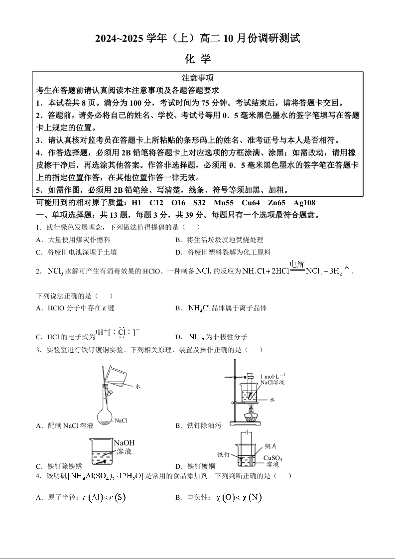 江苏省南通市2024~2025学年(上)高二10月份调研测试化学+答案