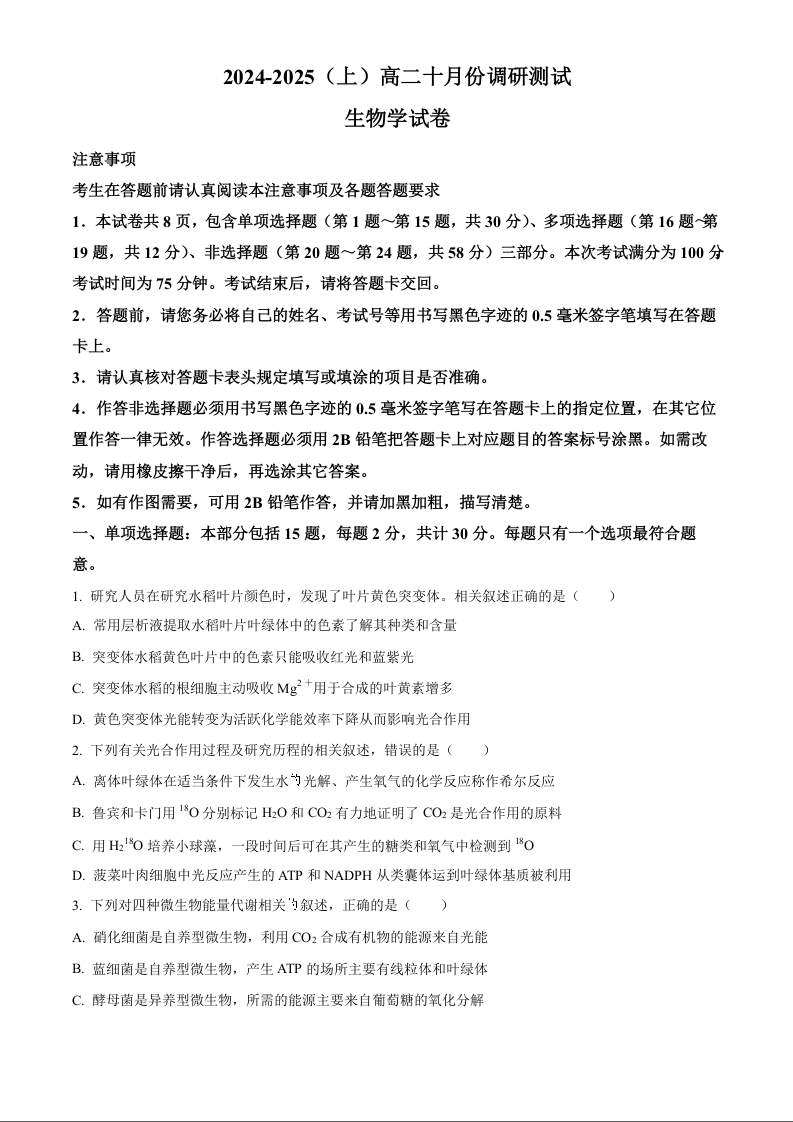 江苏省南通市2024~2025学年(上)高二10月份调研测试生物+答案