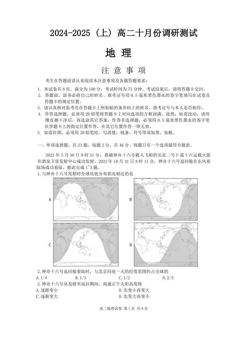 江苏省南通市2024~2025学年(上)高二10月份调研测试地理