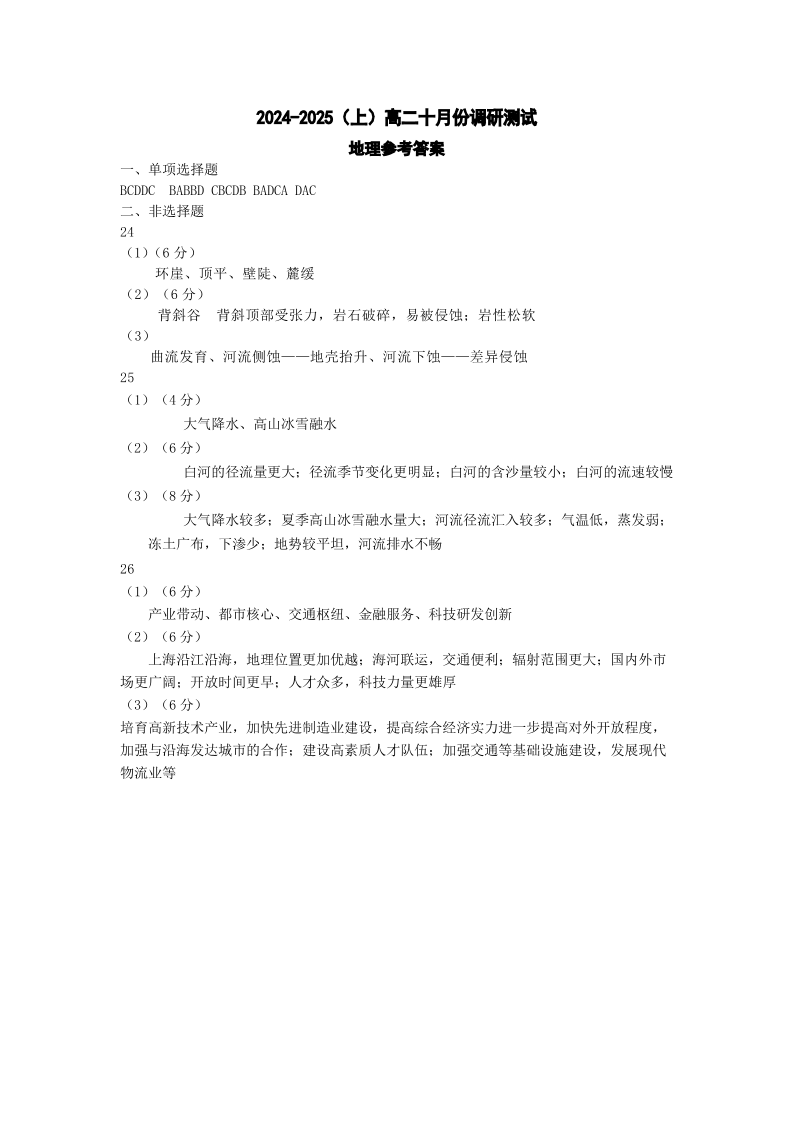 江苏省南通市2024~2025学年(上)高二10月份调研测试地理答案