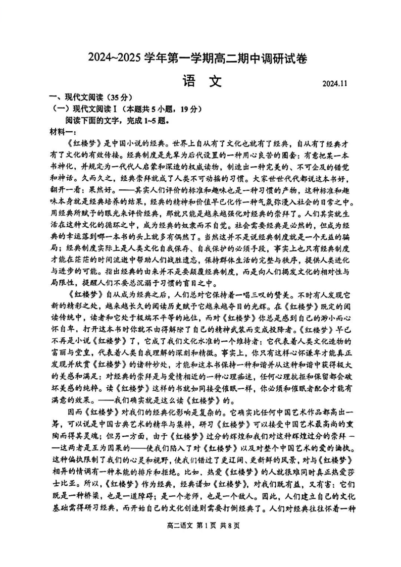 江苏省苏州市2024-2025学年第一学期高二期中调研语文