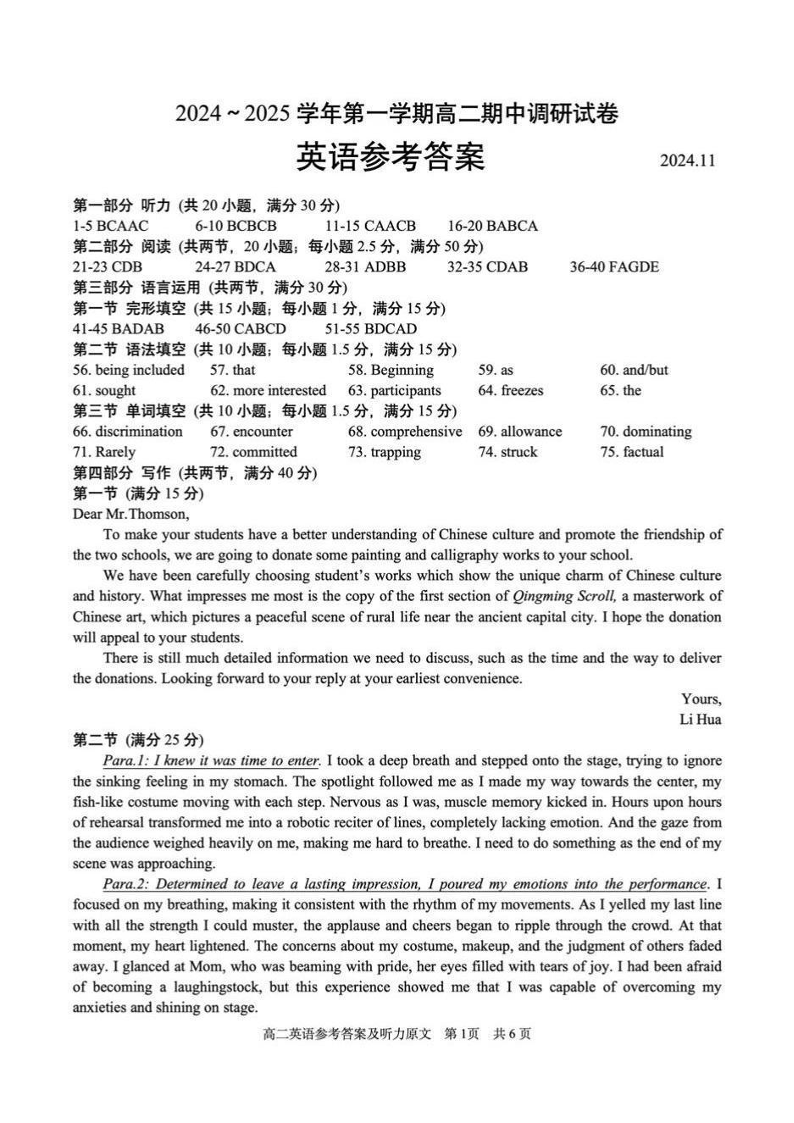 江苏省苏州市2024-2025学年第一学期高二期中调研英语答案