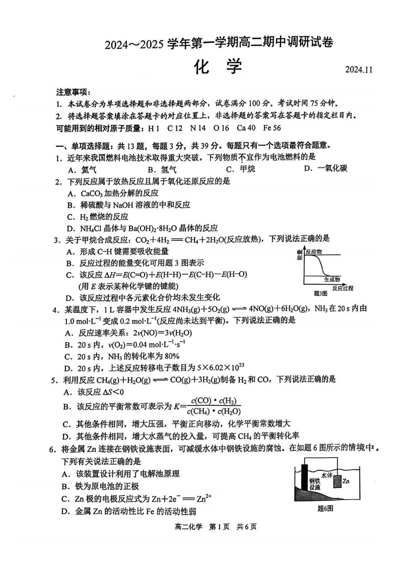 江苏省苏州市2024-2025学年第一学期高二期中调研化学