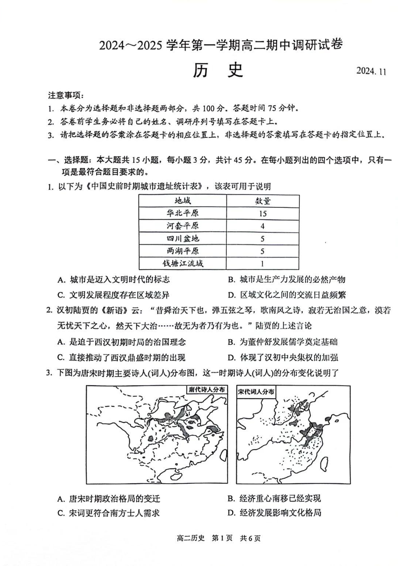 江苏省苏州市2024-2025学年第一学期高二期中调研历史