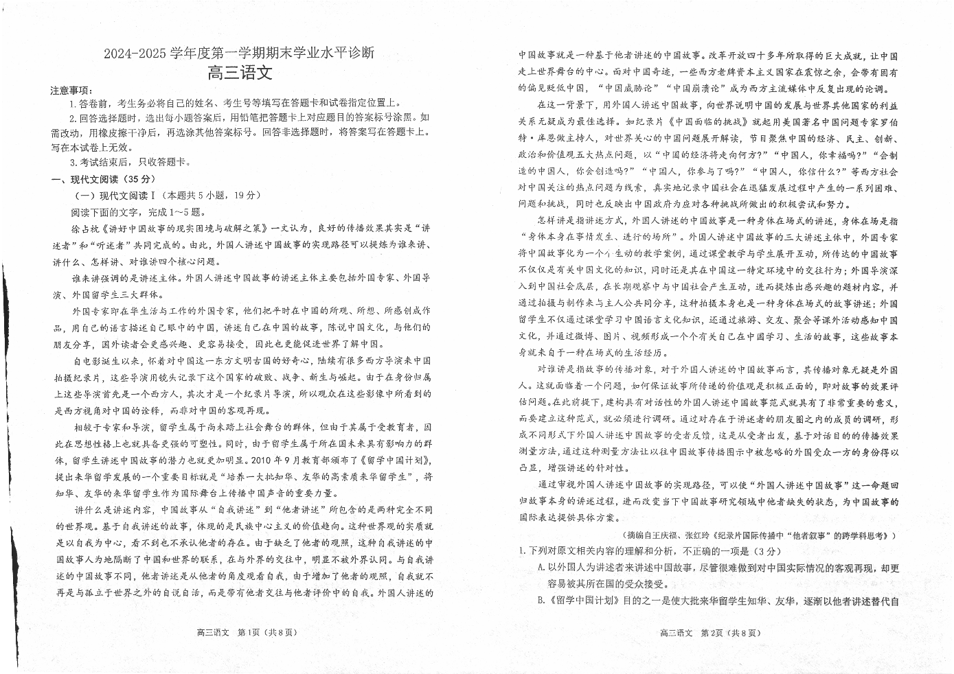 山东省威海市2024-2025学年第一学期1月高三期末学业水平诊断语文