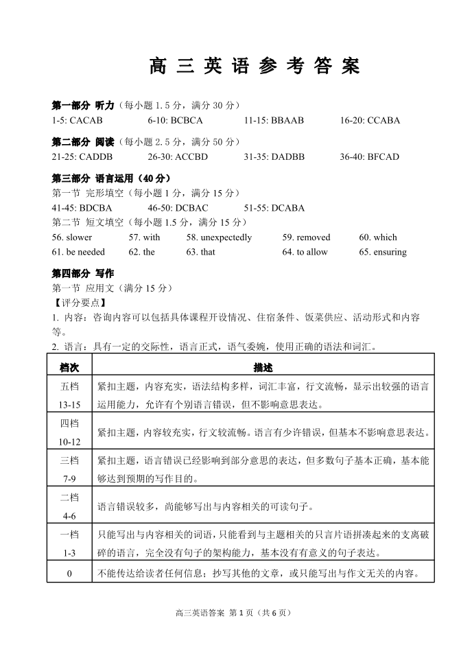 山东省威海市2024-2025学年第一学期1月高三期末学业水平诊断英语答案