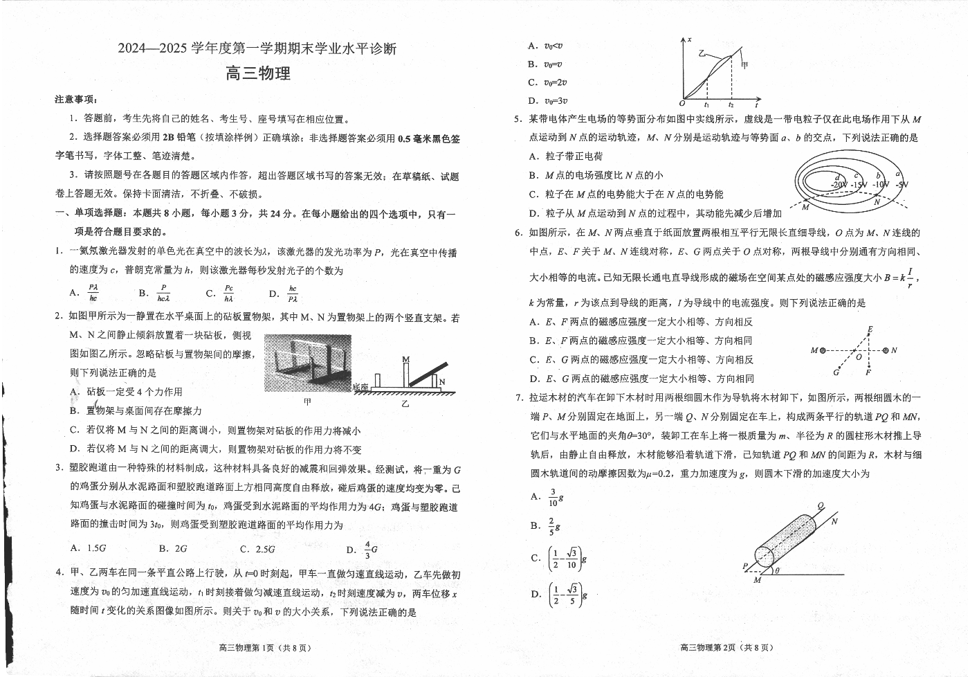 山东省威海市2024-2025学年第一学期1月高三期末学业水平诊断物理