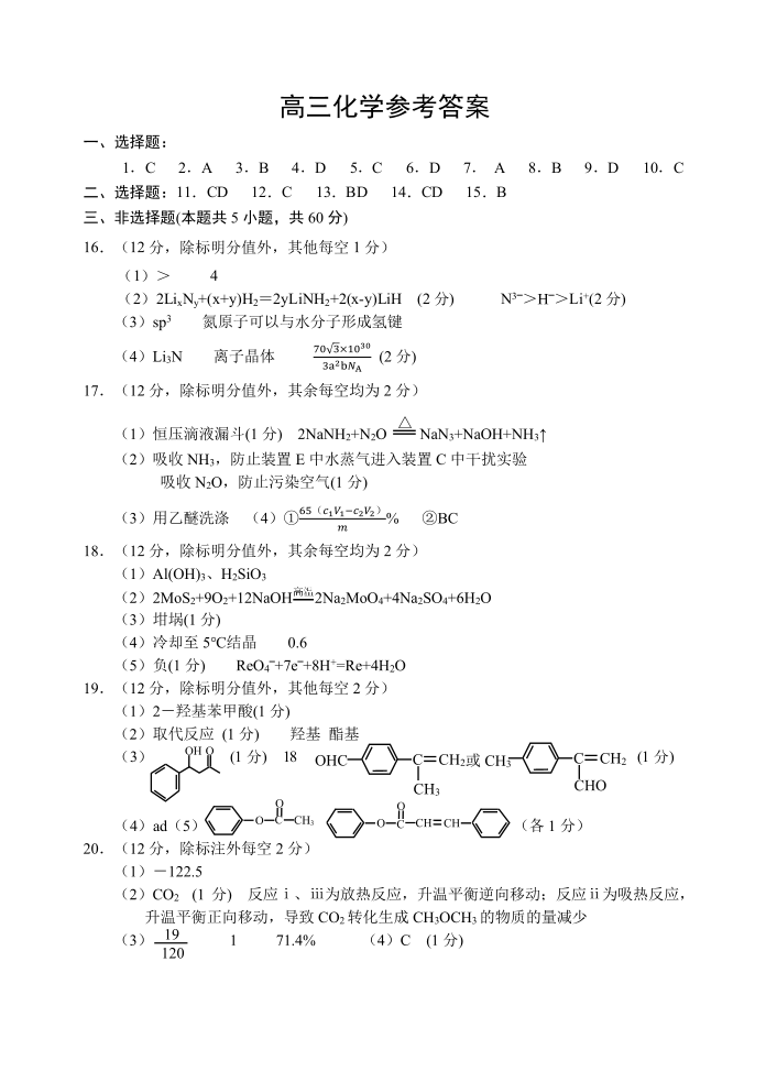 山东省威海市2024-2025学年第一学期1月高三期末学业水平诊断化学答案