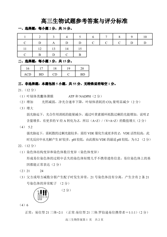 山东省威海市2024-2025学年第一学期1月高三期末学业水平诊断生物答案