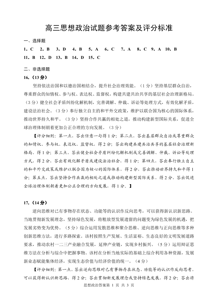山东省威海市2024-2025学年第一学期1月高三期末学业水平诊断政治答案