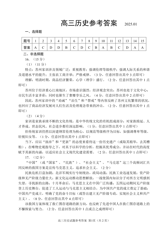山东省威海市2024-2025学年第一学期1月高三期末学业水平诊断历史答案