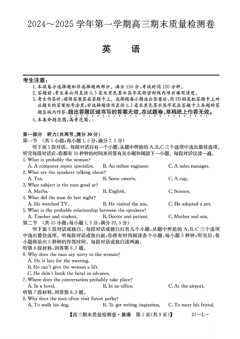 山西省卓越联盟2024-2025学年上学期1月高三期末质量检测英语+答案