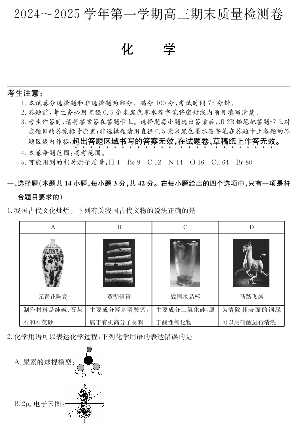 山西省卓越联盟2024-2025学年上学期1月高三期末质量检测化学