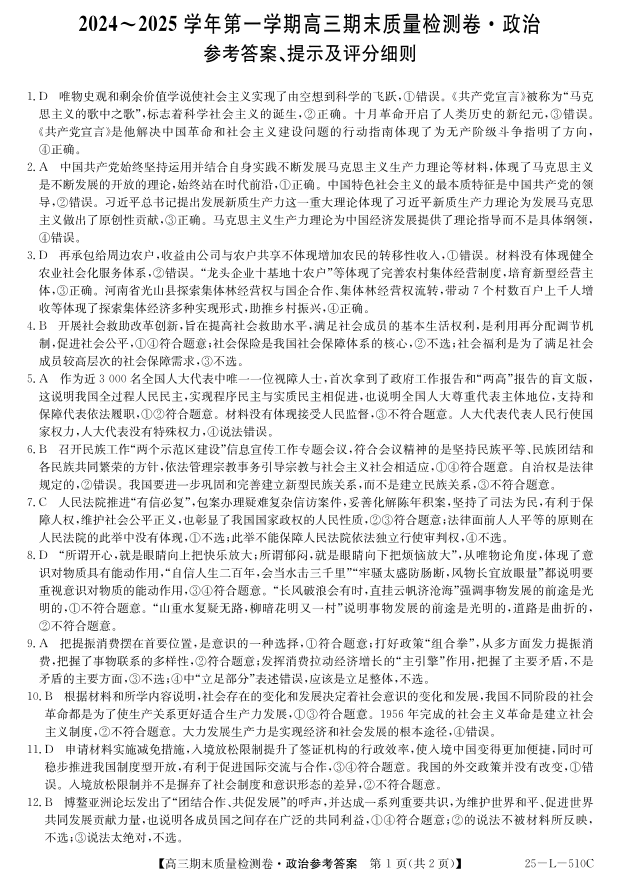 山西省卓越联盟2024-2025学年上学期1月高三期末质量检测政治答案