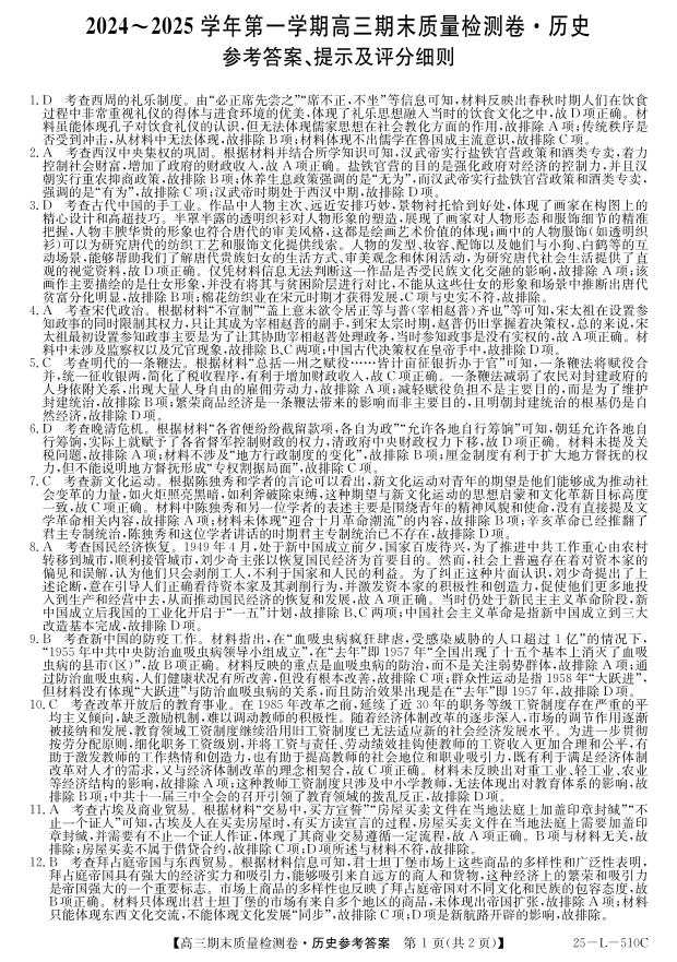 山西省卓越联盟2024-2025学年上学期1月高三期末质量检测历史答案