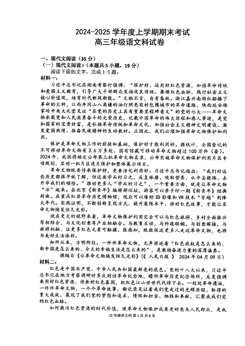 辽宁省五强高中2024-2025学年上学期1月高三期末考试语文+答案