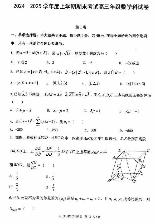 辽宁省五强高中2024-2025学年上学期1月高三期末考试数学+答案