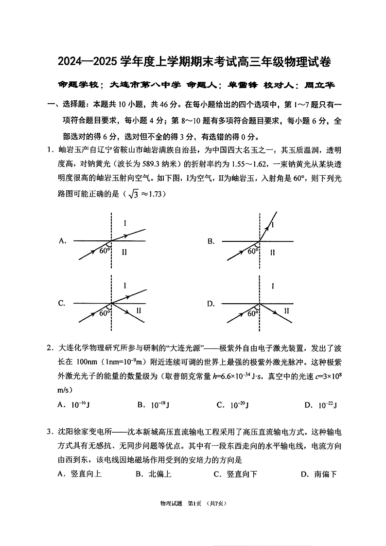 辽宁省五强高中2024-2025学年上学期1月高三期末考试物理+答案