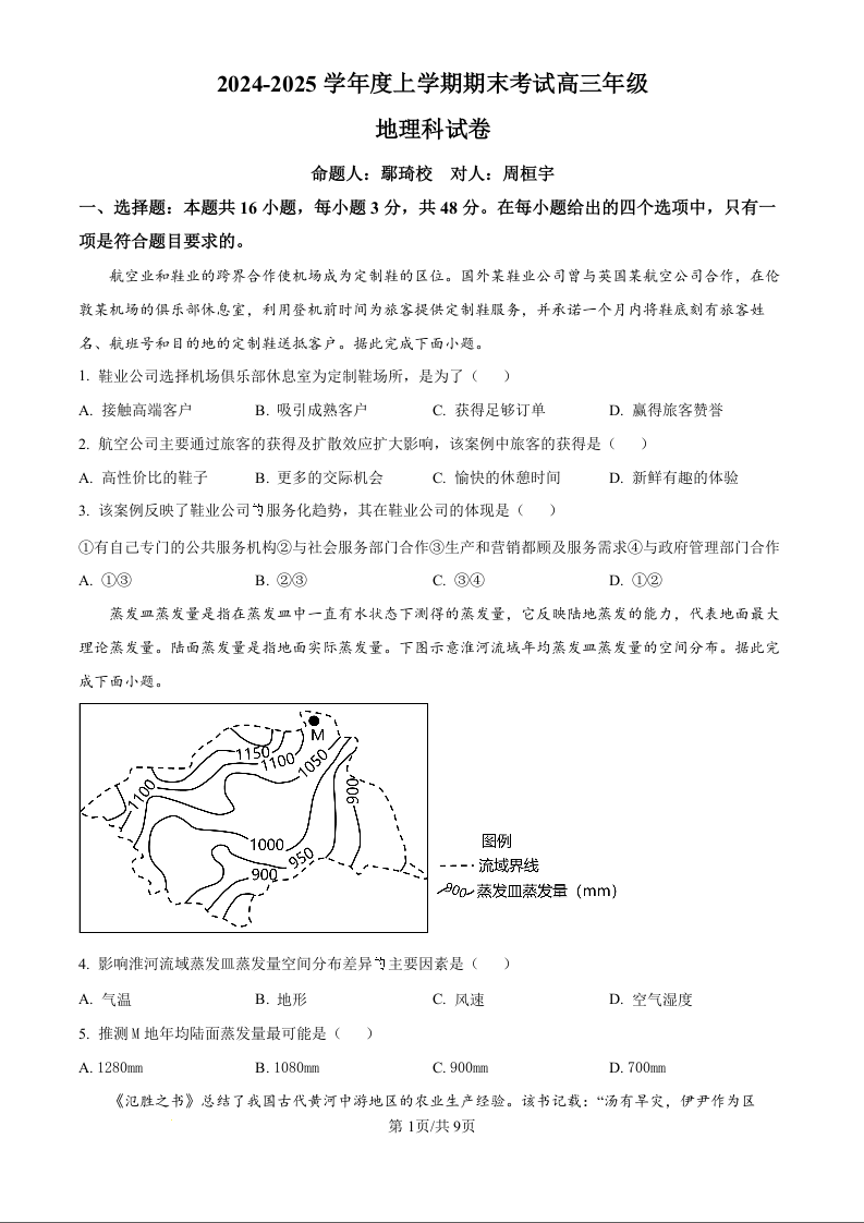 辽宁省五强高中2024-2025学年上学期1月高三期末考试地理+答案