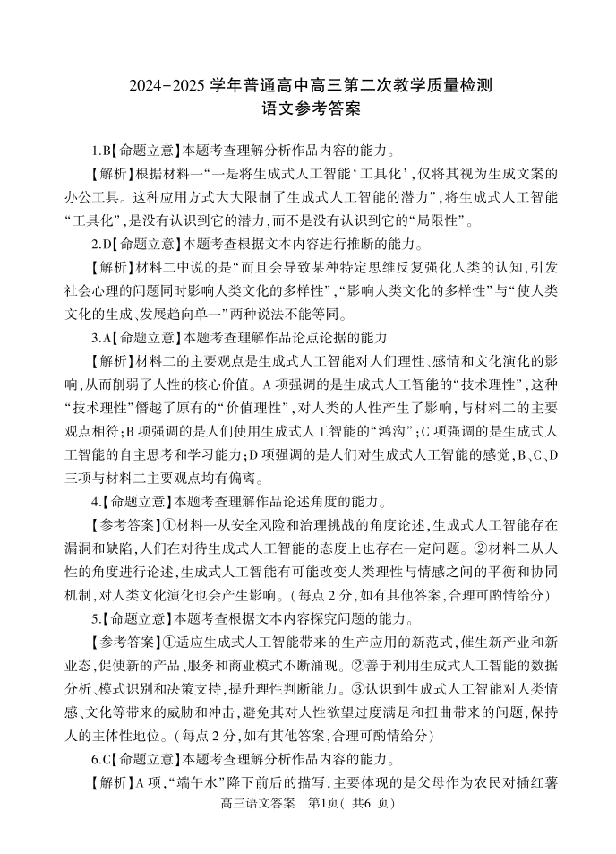 河南省信阳市2024-2025学年上学期1月高三二模检测语文答案