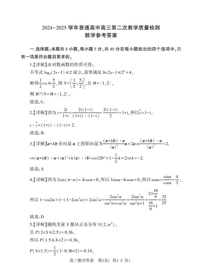 河南省信阳市2024-2025学年上学期1月高三二模检测数学答案