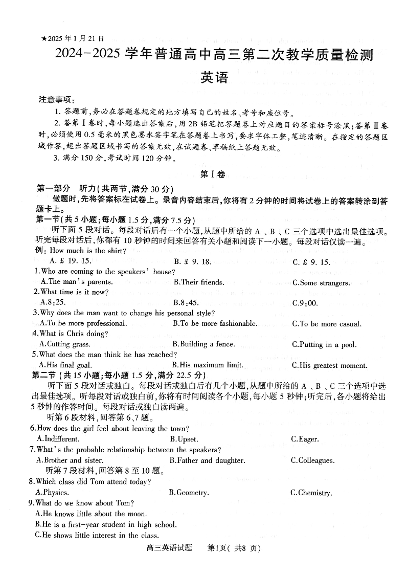 河南省信阳市2024-2025学年上学期1月高三二模检测英语