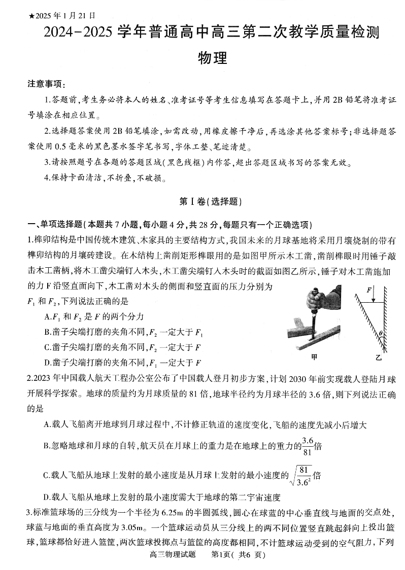 河南省信阳市2024-2025学年上学期1月高三二模检测物理