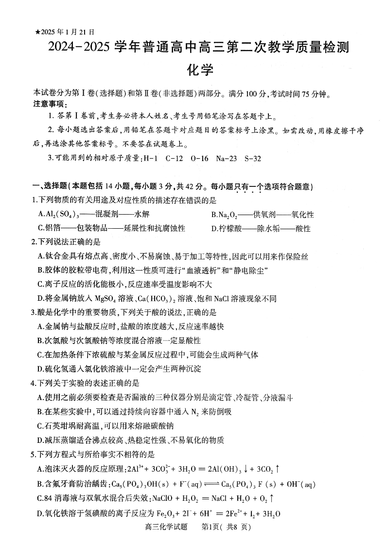 河南省信阳市2024-2025学年上学期1月高三二模检测化学