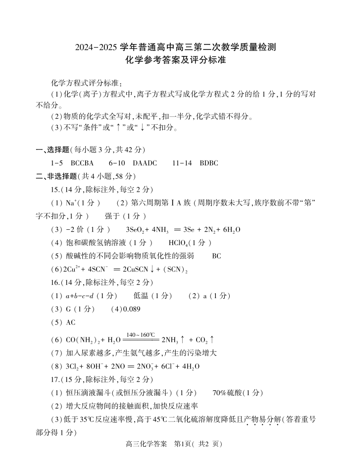 河南省信阳市2024-2025学年上学期1月高三二模检测化学答案