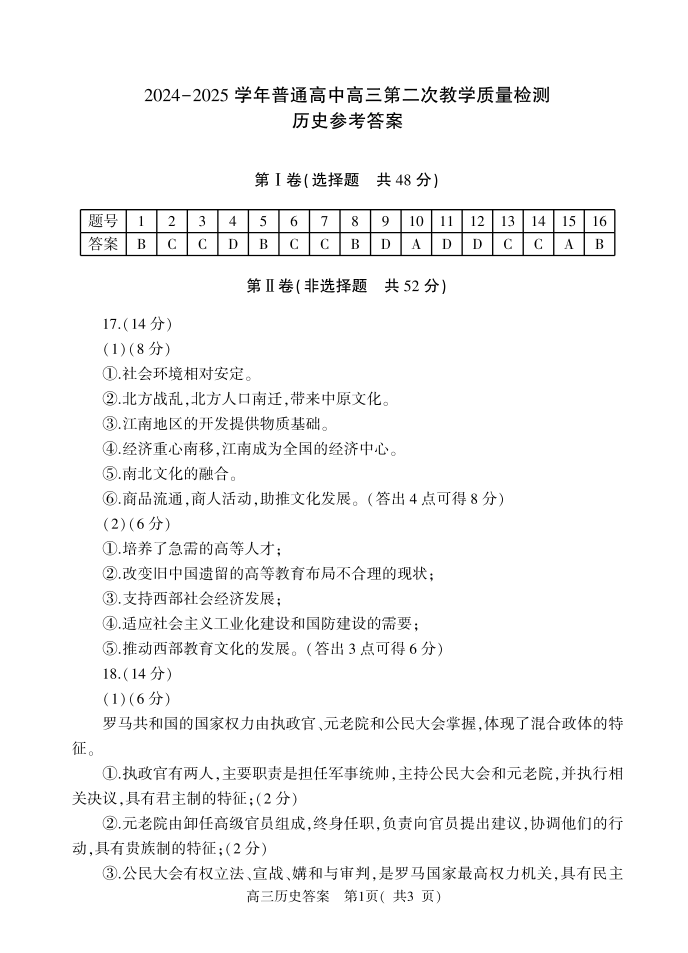 河南省信阳市2024-2025学年上学期1月高三二模检测历史答案