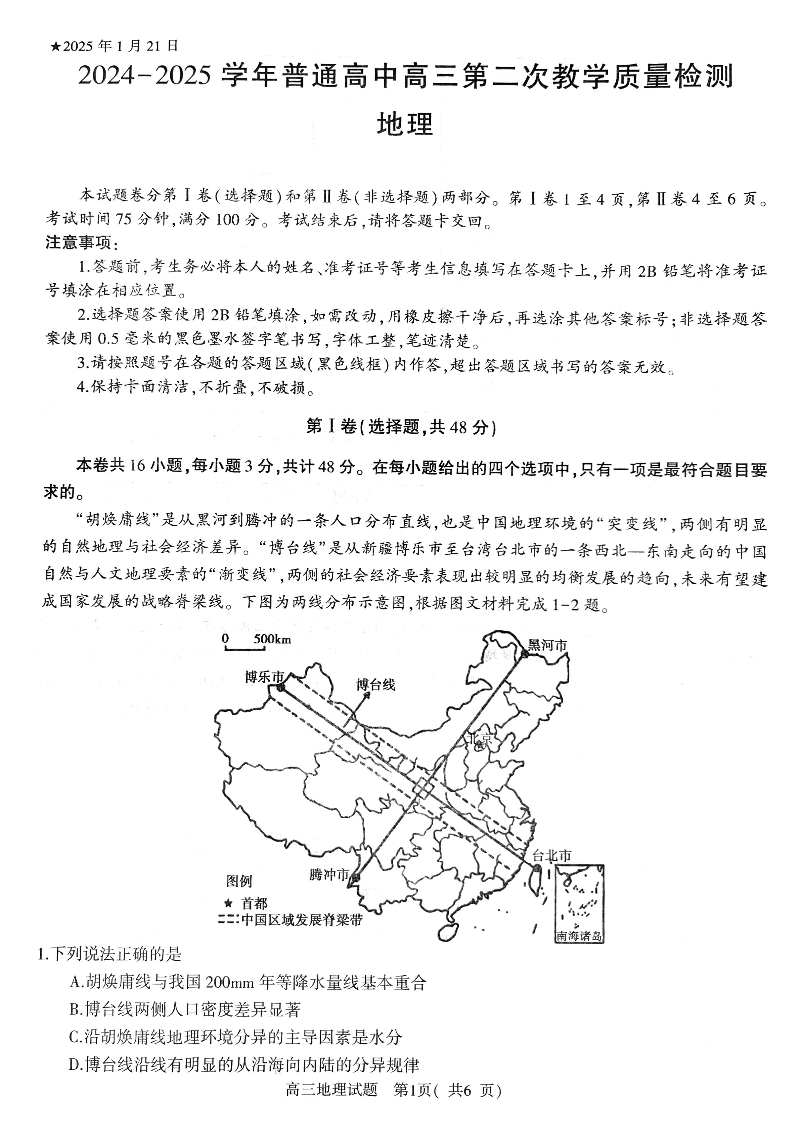 河南省信阳市2024-2025学年上学期1月高三二模检测地理