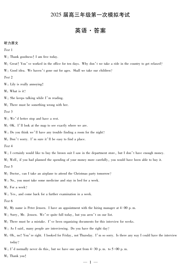 河南省安阳市2024-2025学年上学期1月高三一模考试英语答案