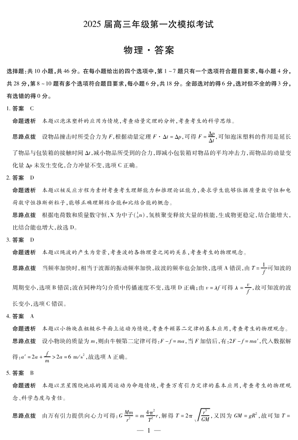 河南省安阳市2024-2025学年上学期1月高三一模考试物理答案