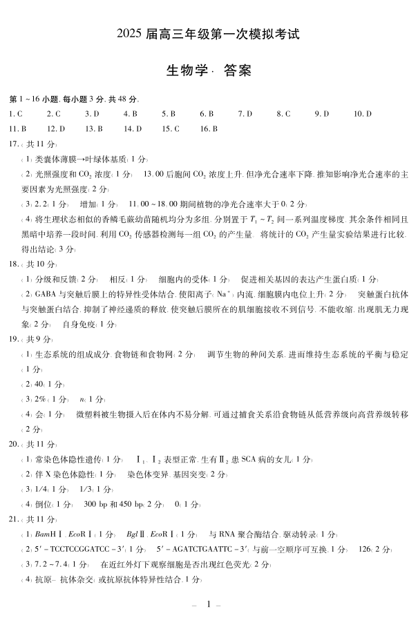 河南省安阳市2024-2025学年上学期1月高三一模考试生物答案