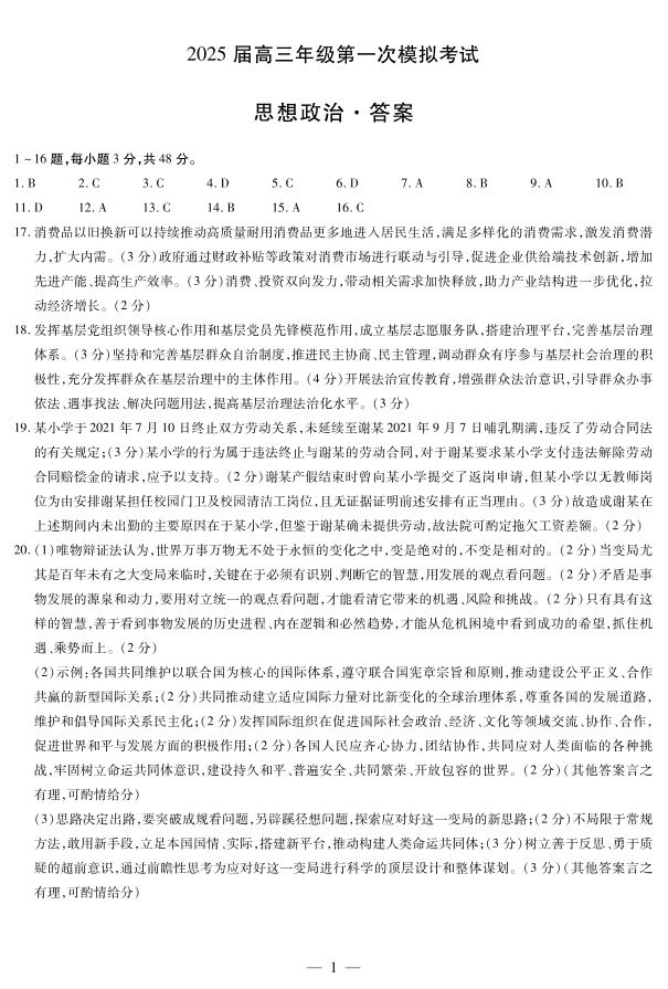 河南省安阳市2024-2025学年上学期1月高三一模考试政治答案