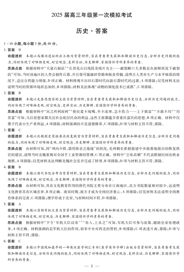 河南省安阳市2024-2025学年上学期1月高三一模考试历史答案