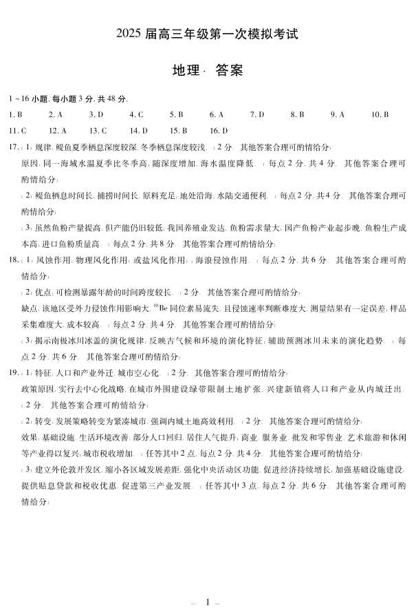河南省安阳市2024-2025学年上学期1月高三一模考试地理答案