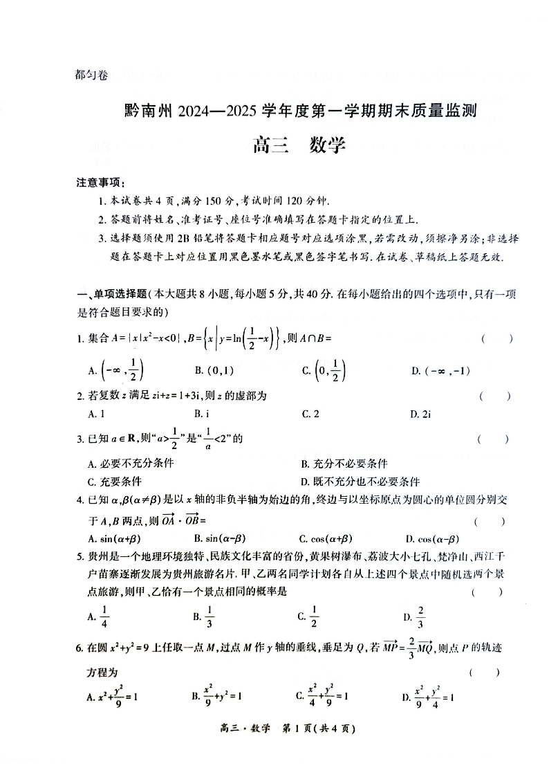 贵州省黔南州2024-2025学年上学期1月高三期末考试数学