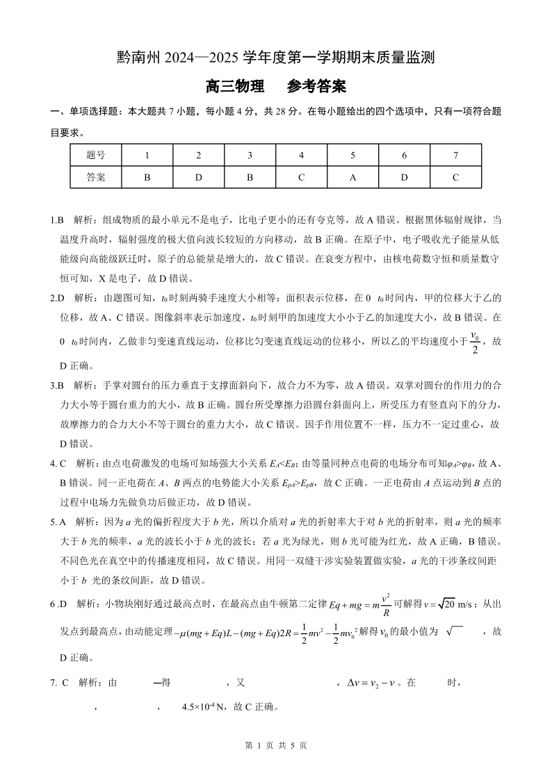 贵州省黔南州2024-2025学年上学期1月高三期末考试物理答案