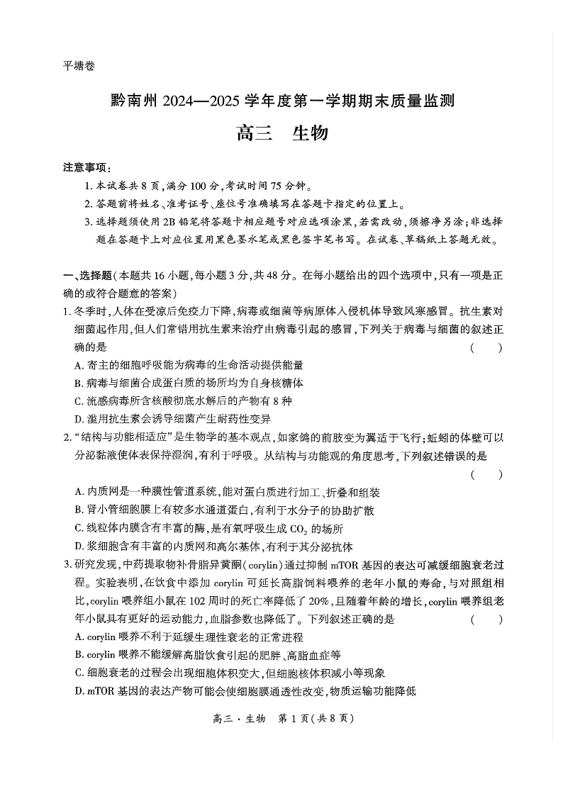 贵州省黔南州2024-2025学年上学期1月高三期末考试生物