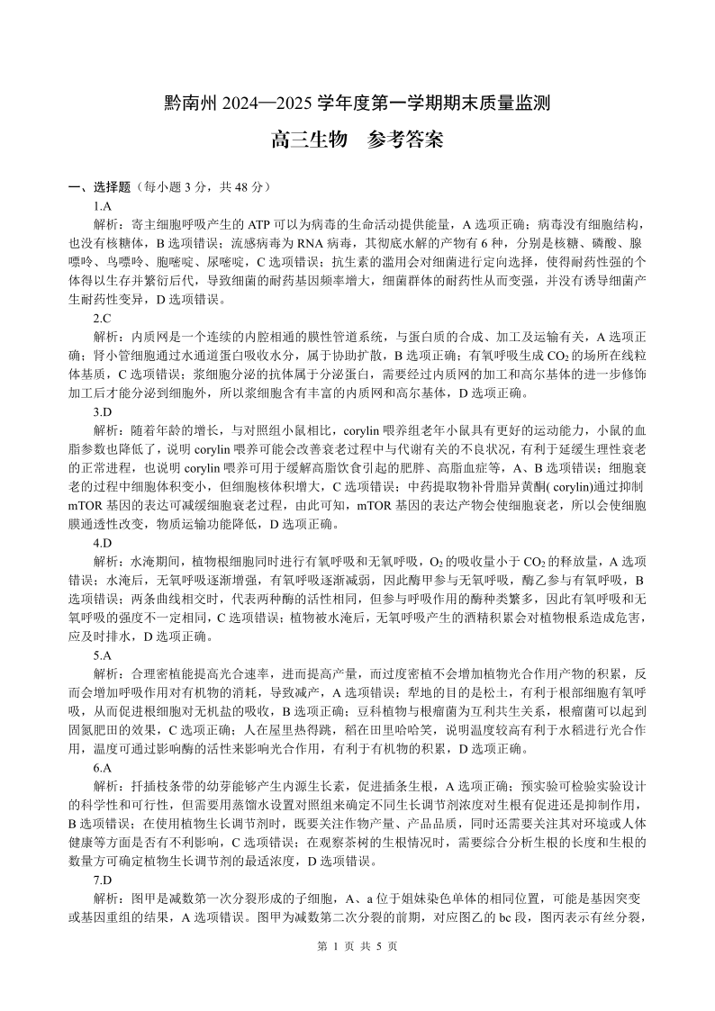 贵州省黔南州2024-2025学年上学期1月高三期末考试生物答案