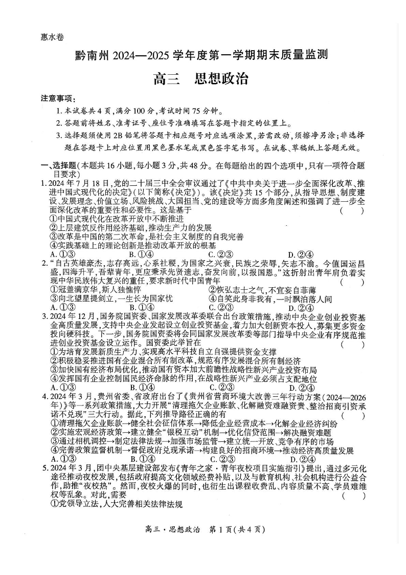 贵州省黔南州2024-2025学年上学期1月高三期末考试政治