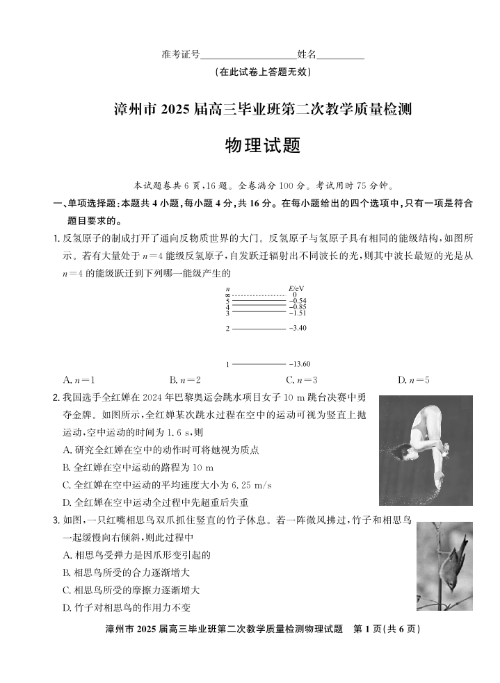 福建省漳州市2024-2025学年上学期1月高三期末考试物理