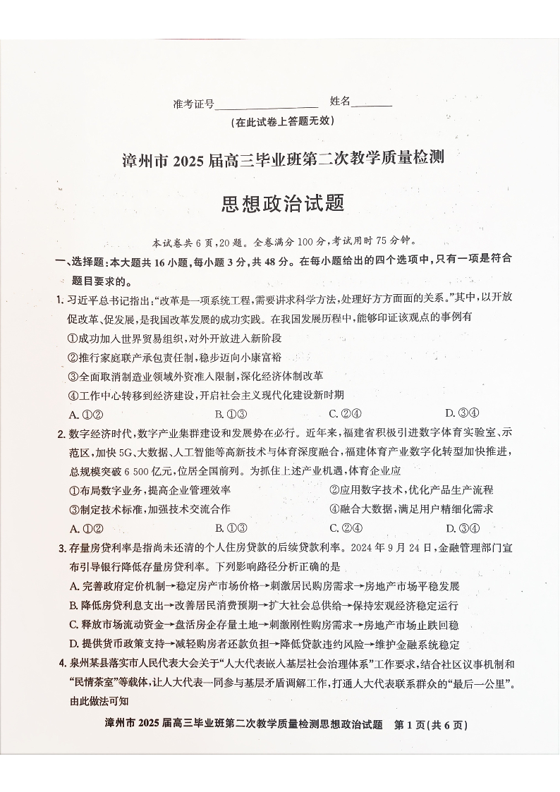 福建省漳州市2024-2025学年上学期1月高三期末考试政治