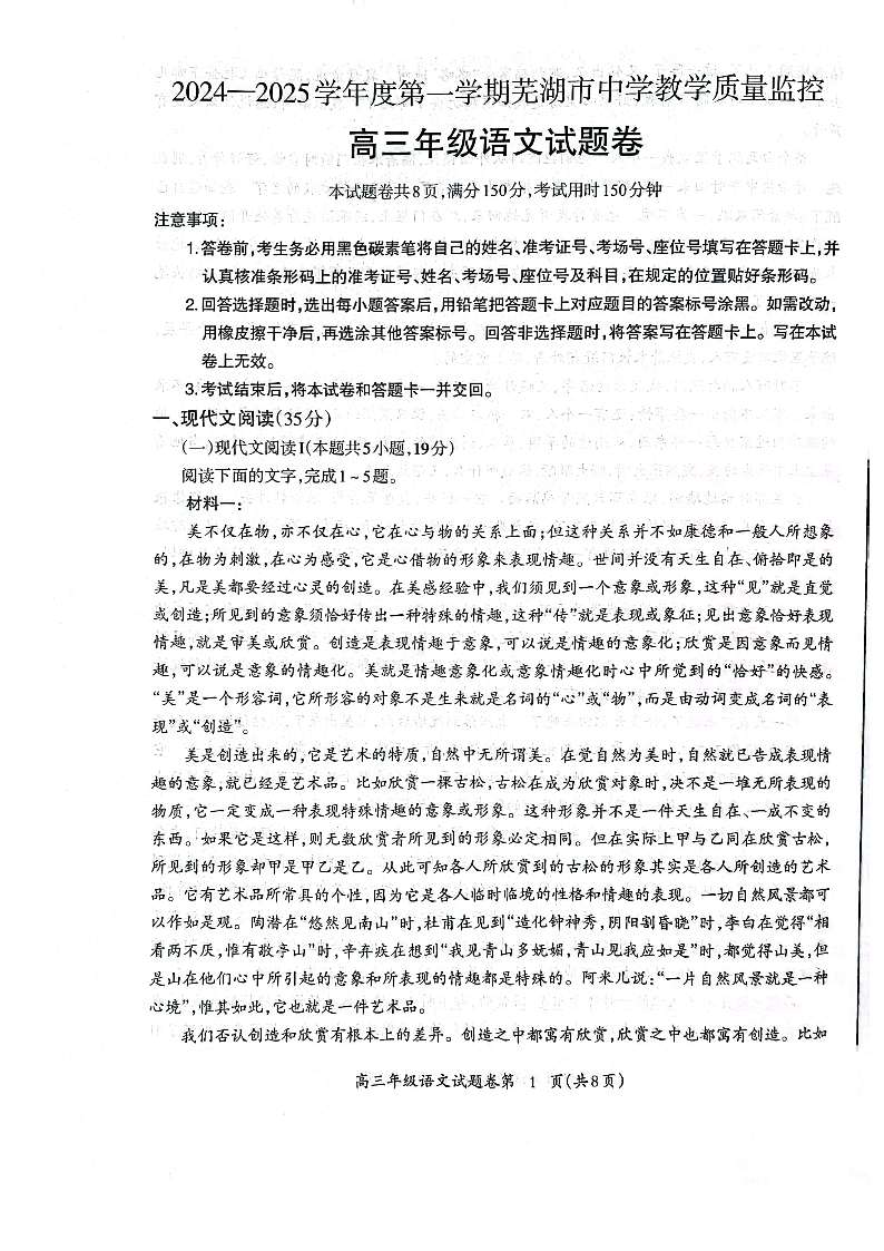 安徽省芜湖市2024-2025学年上学期1月高三期末考试语文+答案
