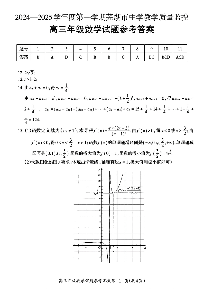 安徽省芜湖市2024-2025学年上学期1月高三期末考试数学答案