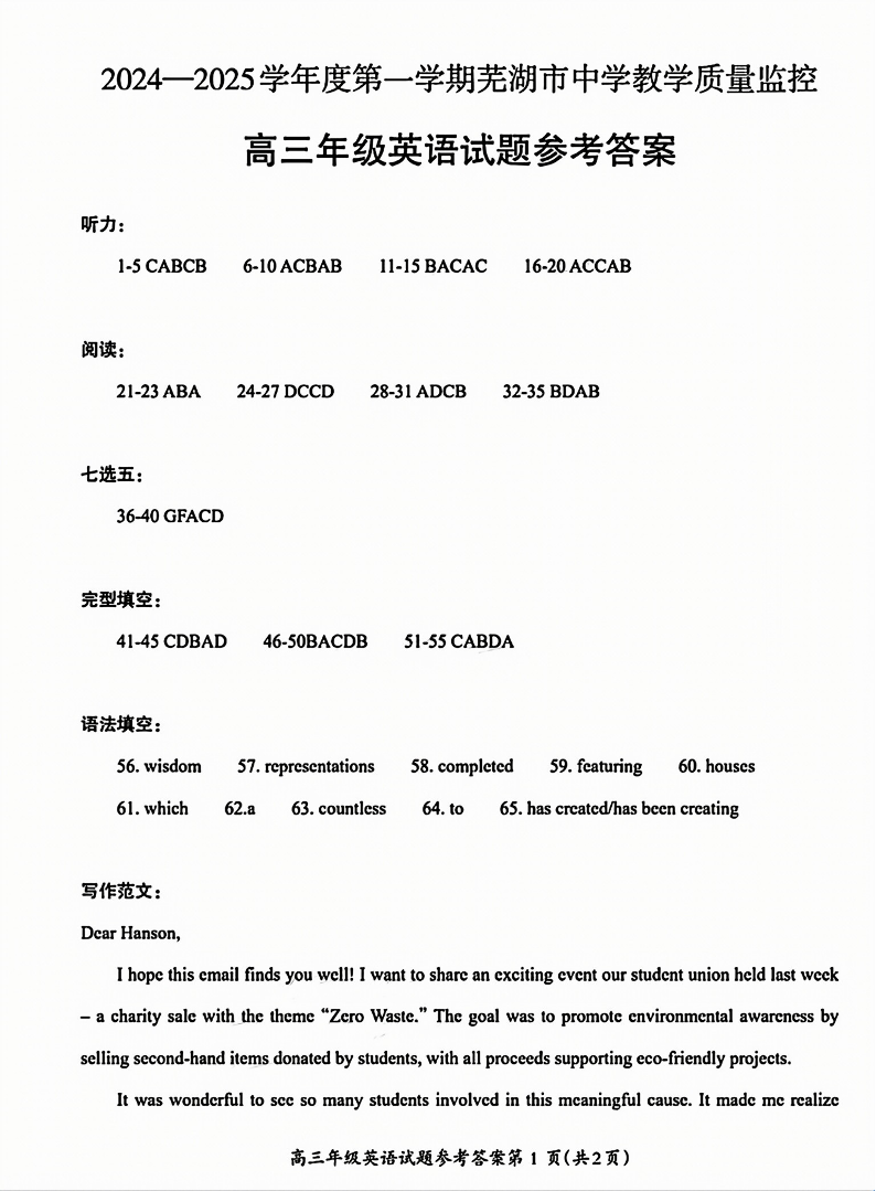 安徽省芜湖市2024-2025学年上学期1月高三期末考试英语答案