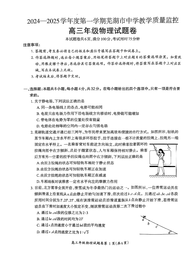 安徽省芜湖市2024-2025学年上学期1月高三期末考试物理